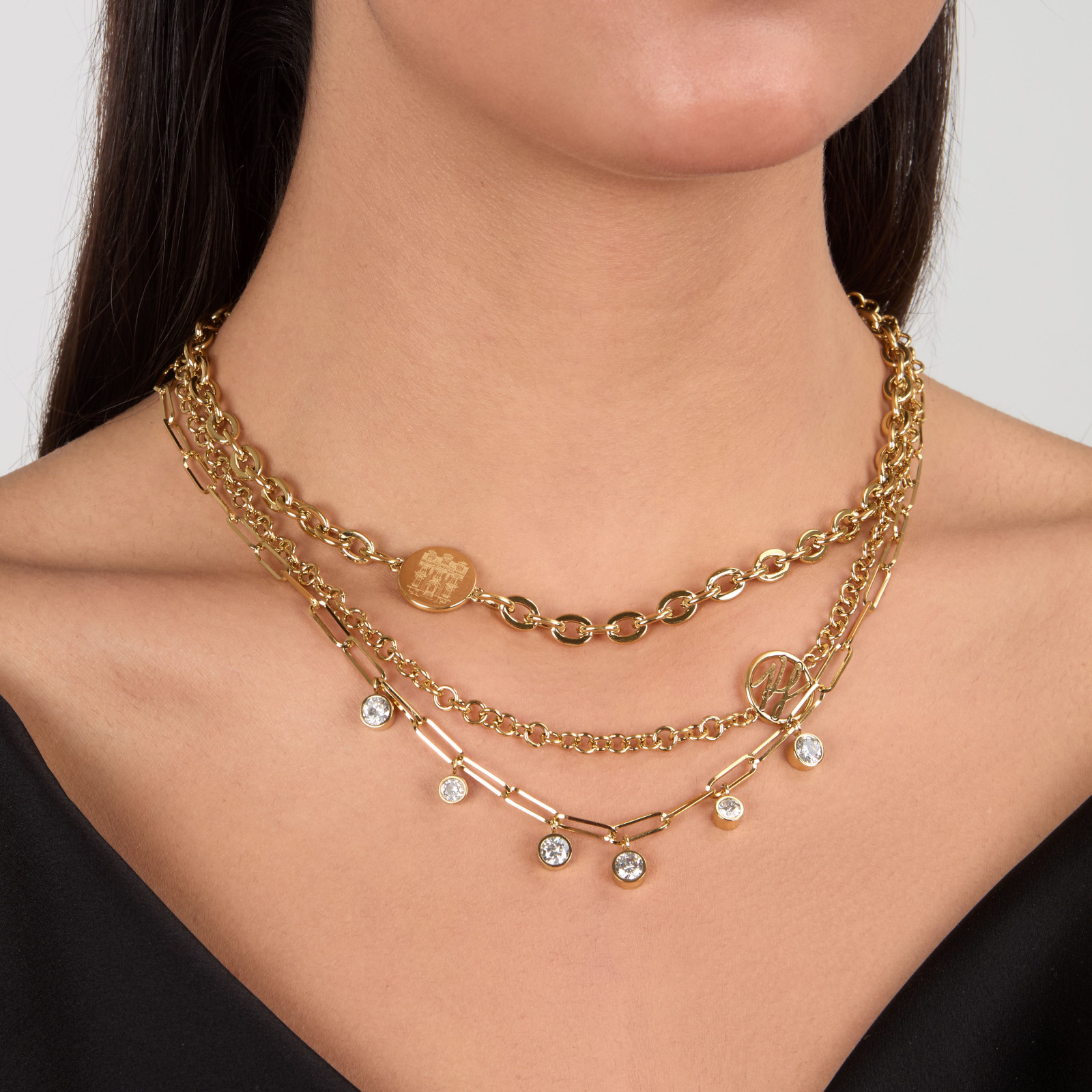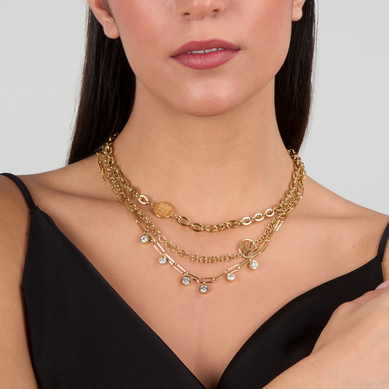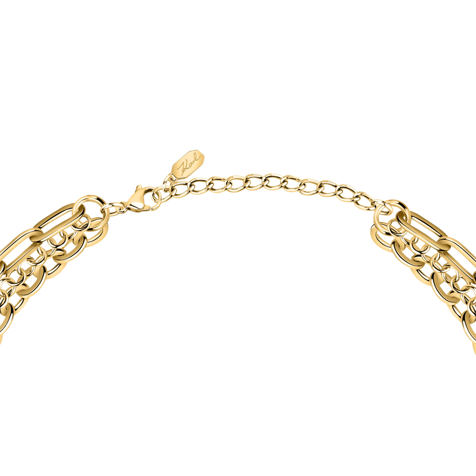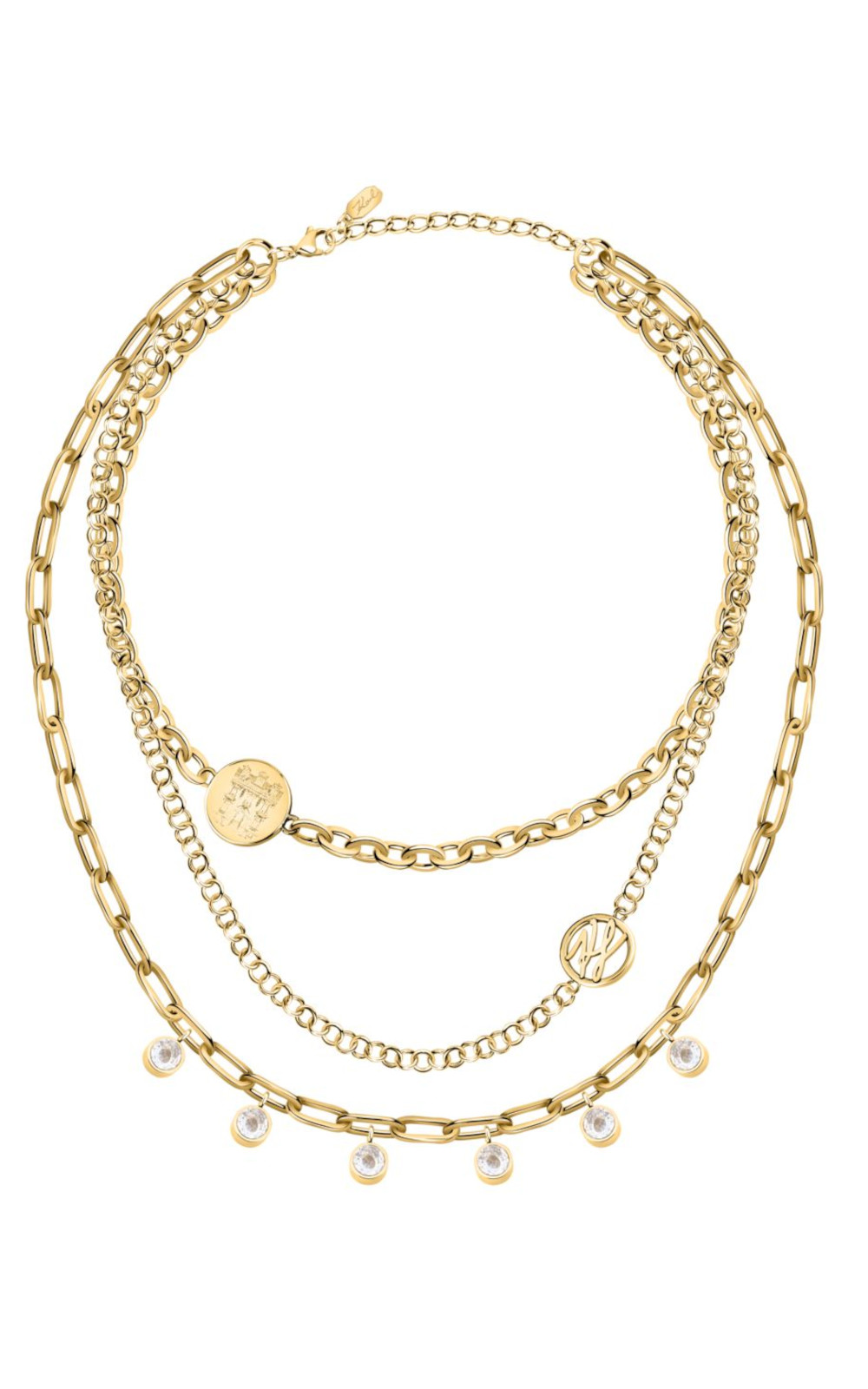 Γυναικείο κολιέ KARL LAGERFELD χρυσού χρώματος με τριπλή αλυσίδα και πέτρες. Είναι κατασκευασμένο από ανοξείδωτο ατσάλι και είναι διακοσμημένο με σχέδιο με άσπρες πέτρες και λογότυπο της εταιρείας(38/42/45+5cm).