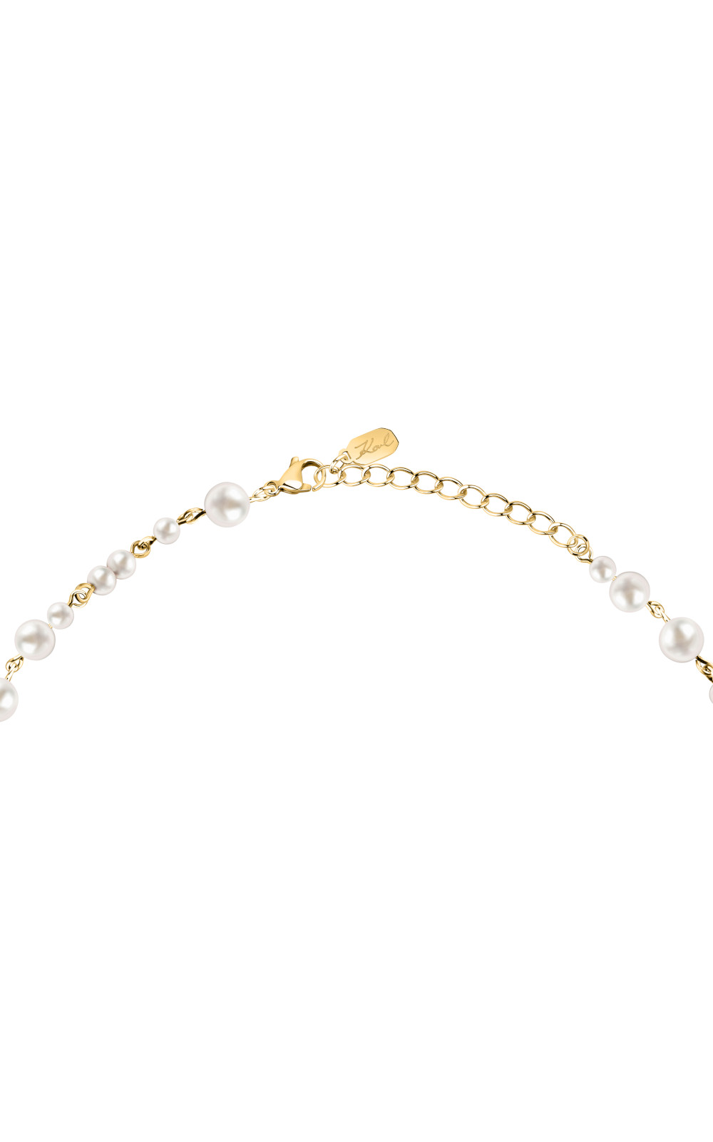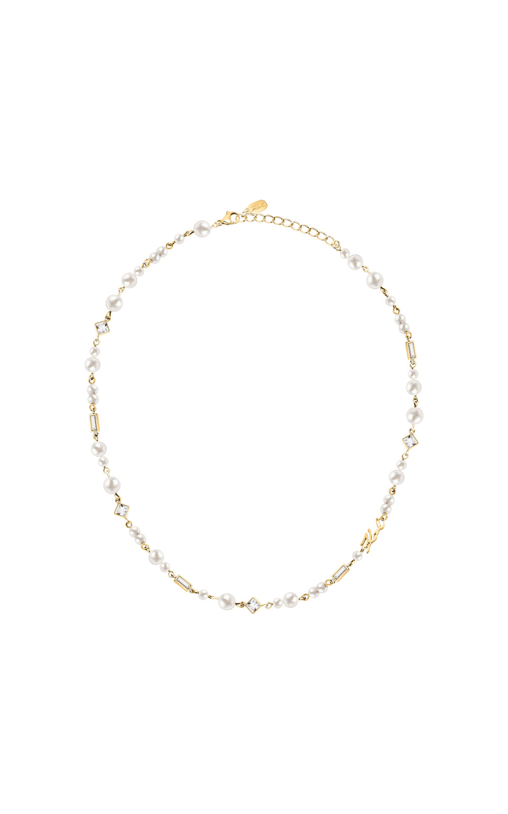 Γυναικείο κολιέ KARL LAGERFELD χρυσού χρώματος. Είναι κατασκευασμένο από ανοξείδωτο ατσάλι και είναι διακοσμημένο με πέρλες, πέτρες και λογότυπο(42,5+5cm).